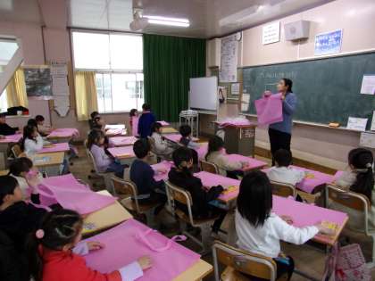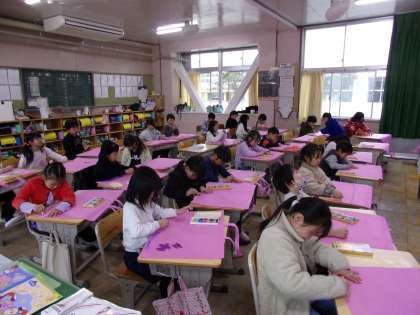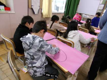 作品バッグを作っていました、名前を書く場所、絵を描く場所の注意点を聞き、自分たちが寿恵野小学校で好きな場所を描いていました。