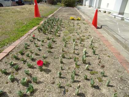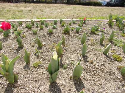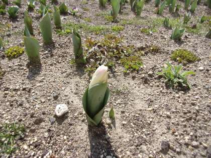 いくつかの赤いチューリップに続いて、いくつかの白いチューリップも咲き始めています。まだ、咲いていないものも、かなりつぼみが膨らんでいます。
