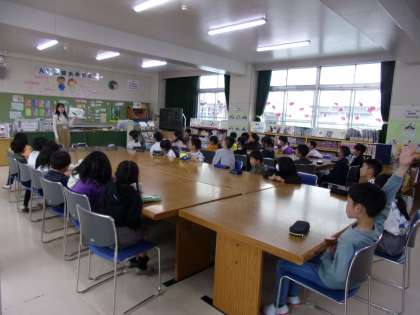 司書さんから、図書室の本の分類について、教えてもらっていました。