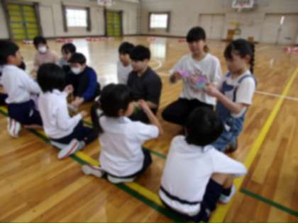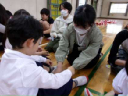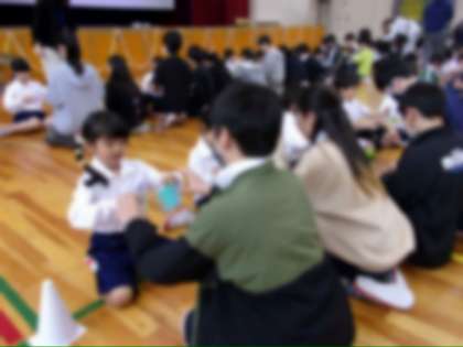 6年生が作ったびゅんびゅんコマをプレゼントしてもらい、一緒に遊びました。6年生が回すコツを教えると、上手に回せるようになり、楽しそうに回していました。教えた6年生も嬉しそうでした。この後は、全校でのなかよし活動(1年生を祝う会第2部)です。