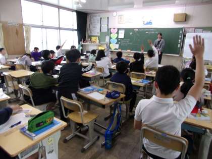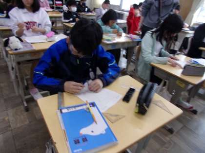 点対称の図形を描きます。点対称の図形の性質を活かします。みんなで方法を考え、描いていました。