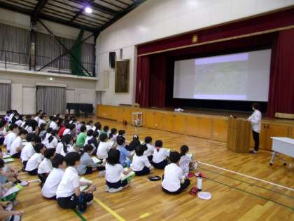 その後、5年生のメダカの授業の講師の方々に、さらに数名が加わり、4年生全員を対象にビオトープの授業を行っていただきました。