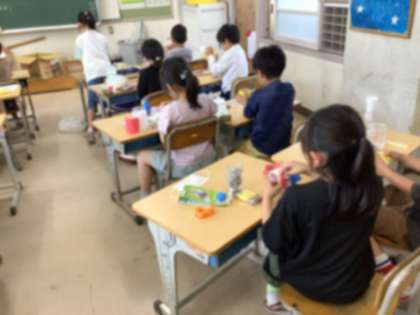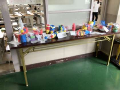 あき容器を使って、想像を広げながら作品を作っていました。この時間で完成し、作品を廊下に並べて、鑑賞できるようにしました。