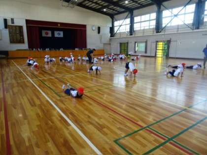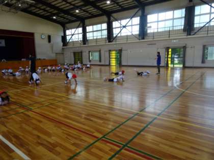 動物になりきって、動物の動きをする学習をしていました。挑戦しているのは、イモムシの動きやシャクトリムシの動きです。シャクトリムシは、うつ伏せになって手を伸ばし、腕で体を支えたままつま先で支えている手の方へ足を寄せます。体を支える力が必要なので、なかなか難しいです。