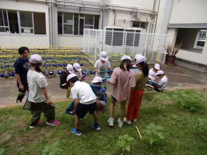 ヒマワリが育ってきました。学習用タブレットを持って、観察していました。