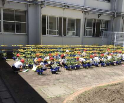 プランターで育てている野菜の観察をしていました。野菜の実ができている子もいました。