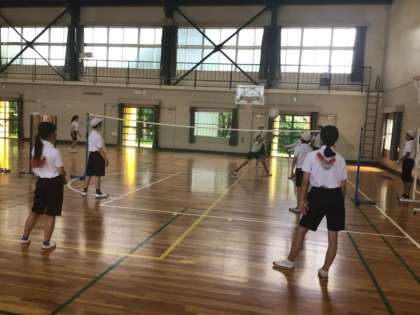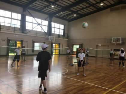 試合をしていました。まだボールの扱いに慣れていないので、1回目のレシーブは手でキャッチしてからパスをしていました。