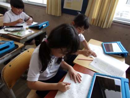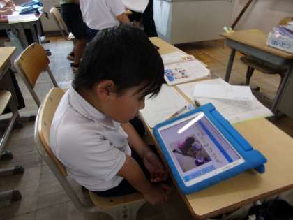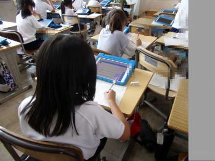 「はじめ」「中」「終わり」の構成で文章を書きます。内容は、自分が家で「している」ことです。一生懸命考えていました。