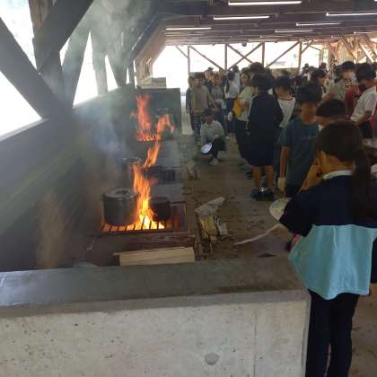 火起こしで作った火種をかまどに運び、まきで調理します。ただし、夕食の時間が確保できるように、火起こしにチャレンジできる時間は時は決まっています。