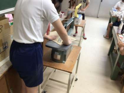 糸のこぎりを使って、板を切っているところです。しっかりと板を押さえて、切り進めていました。切り終わった子は色ぬりをしていました。