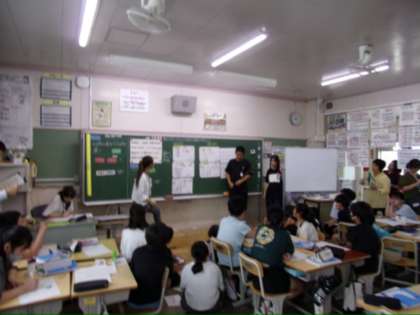 修学旅行の見学先3ヶ所を、全て見て周る順番は何通りあるかを考えました。前の授業までに出てきた説明言葉を使い、どのように考えたのかを説明したり、話し合ったりしました。研究授業として公開し、教員が参観しました。