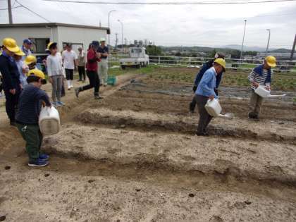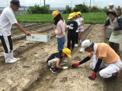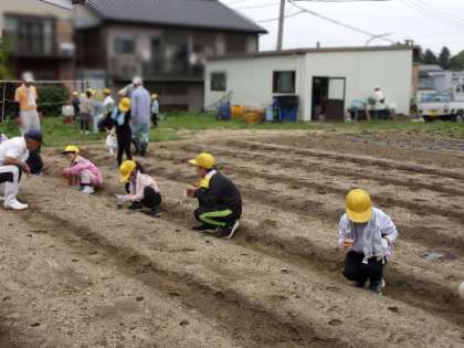 やはり、ダイズの種まきの様子です。おしどり会の皆様は、指導・助言いただくだけでなく、様々な準備をすべてやってくださいました。