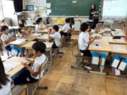 タンバリンやカスタネットを使い、2拍のリズムに合わせて叩きました。打ち終わるとタンバリンを次の子に渡し、全員がいろいろな楽器でリズム打ちをしました。