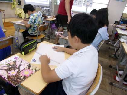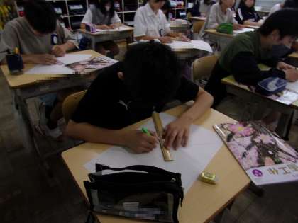 視点を1点に集めることで、遠近法を活かした絵が描けます。まず、その1点を決めて、補助線(?)を引いていました。