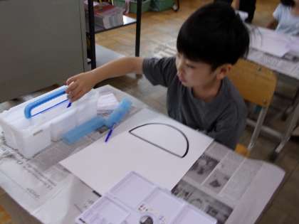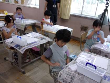 絵の具セットの使い方を学んでいました。この日は、この後、絵の具で、おいしそうなかき氷を描きました。