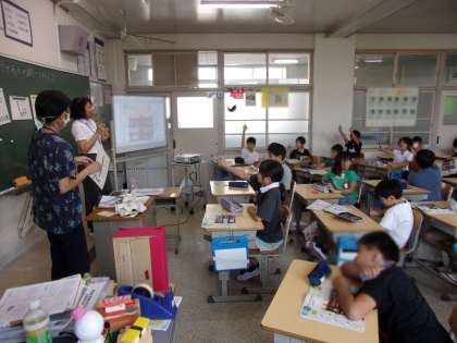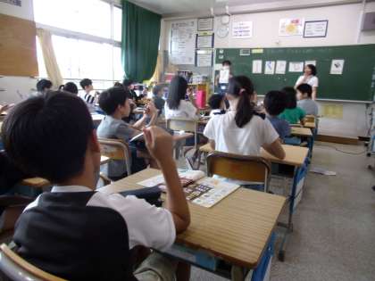 筆箱の中に、何があるかを、「Do you have 〜?」を使って、英語で尋ね、英語で答える活動をしていました。