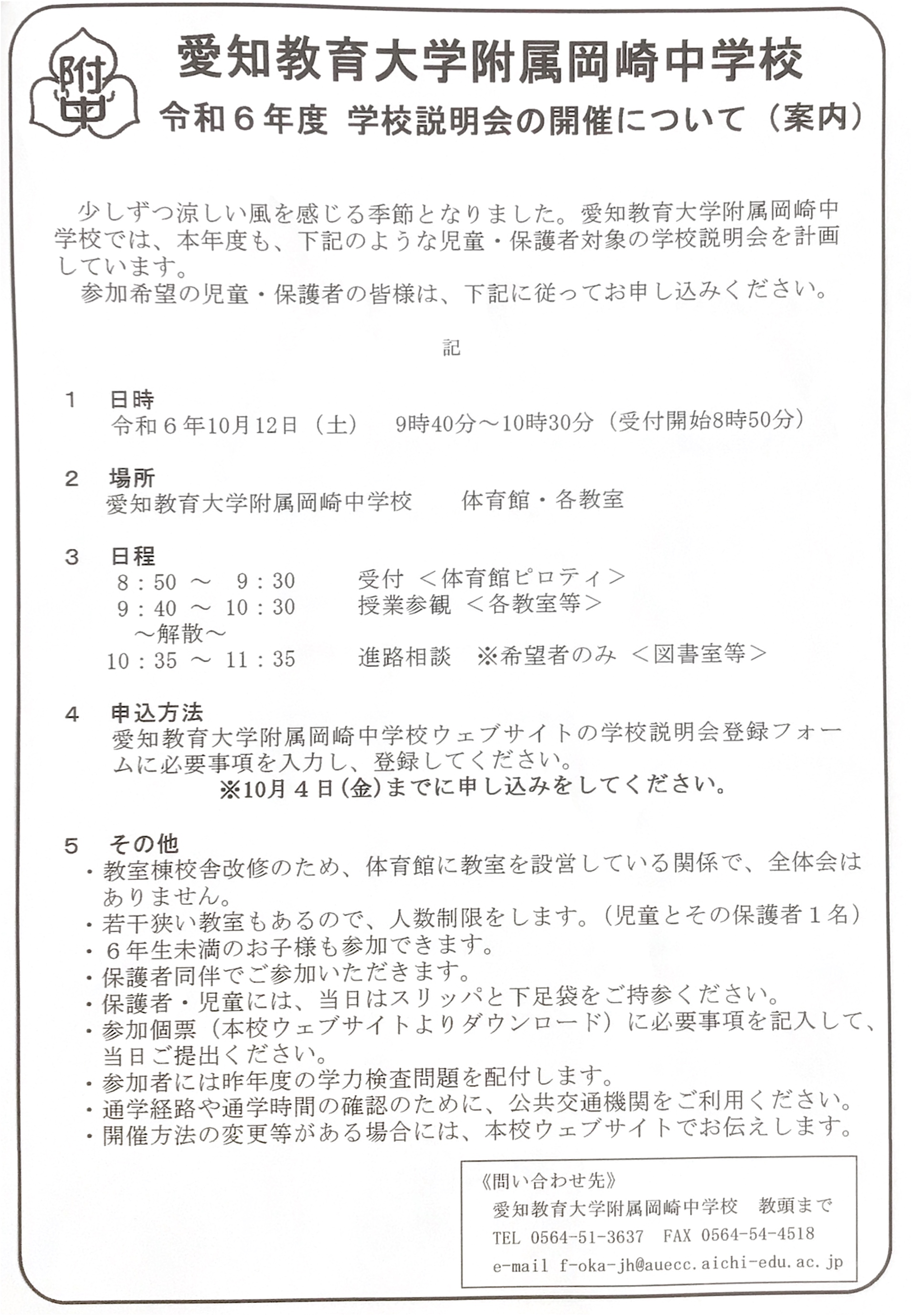 附属岡崎中学校説明会のご案内 公開日 2024/09/06 更新日 2024/09/06 お知らせ 附属岡崎中学校より、説明会のご案内が届きました。 6年生未満のお子さんも参加できます。関心のある方はご覧ください。 附属岡崎中学校説明会案内