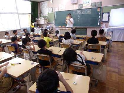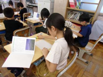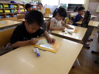 このクラスでは、今日から、宿題に漢字練習が加わっていくのだそうです。初めての漢字練習用のノートが配られ、自分で名前を書き、練習の仕方の見本を表紙の裏に貼りました。