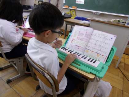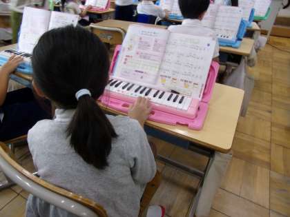 鍵盤ハーモニカの指使いを、何度も練習していました。