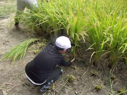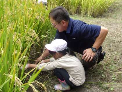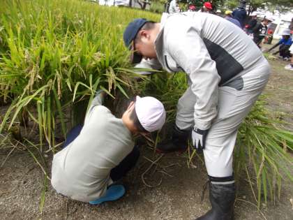 本校のビオトープの大きな特徴の一つとして、ビオトープ内に田んぼがあることが挙げられます。加えて、本校は、大橋園芸さんやJAの方々、「竹の会」のような地域の皆様に多大なるお力添えをいただけます。これらにより、学校内で効率的に稲刈りができるわけです。