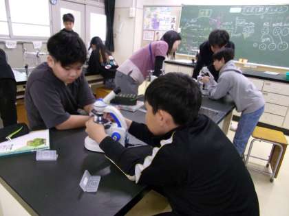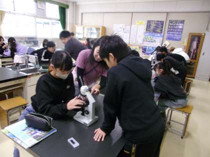 顕微鏡を使って、火山灰を観察していました。先週の授業の1コマです。