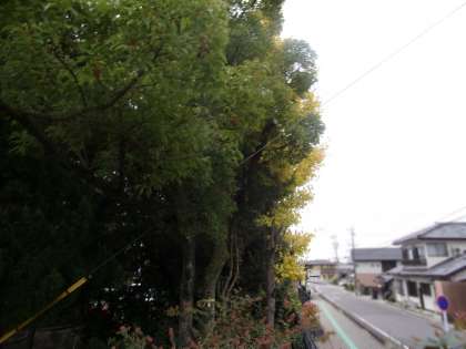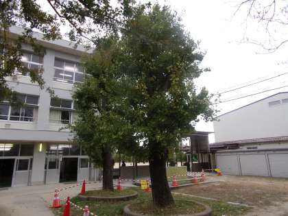 昇降口前のイチョウは、黄色い葉が少しずつ見られるようになっています。なお、3枚目の写真は、道路沿いにある小さなイチョウです。こちらは、既に、とてもきれいに紅葉しています。