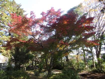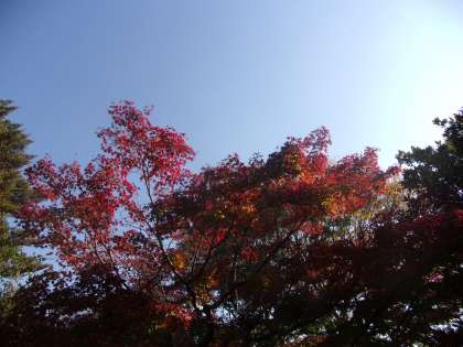 まだ、緑色の葉はありますが、かなり赤くなってきました。イチョウ同様、まもなくピークになると思われます。空の青色と葉の赤色のコントラスト、とてもきれいです。