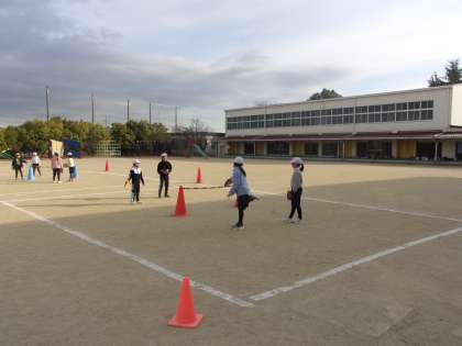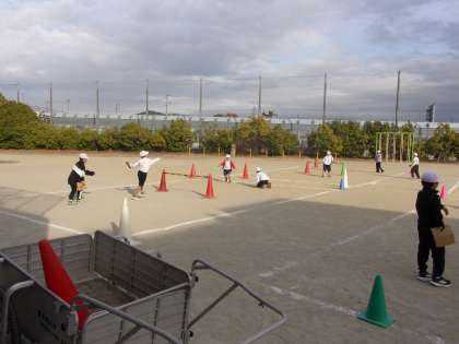 ネット型のゲーム、「テニピン」をしていました。これは、10月に行った教職員の研修会で、本校の教職員が紹介した競技です。小学校でネット型の競技をすることは、なかなか難しいのですが、これなら、みんなで楽しめそうです。