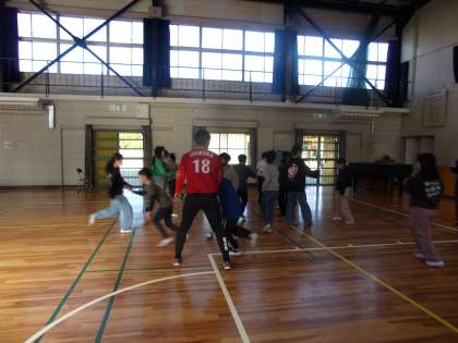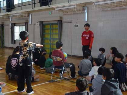 ますは、約35分間、「夢先生」と体を動かすゲームをします。仲間と協力するという要素が含まれていて、「夢先生」と子どもたちとの距離が縮まる時間となります。