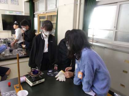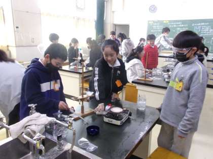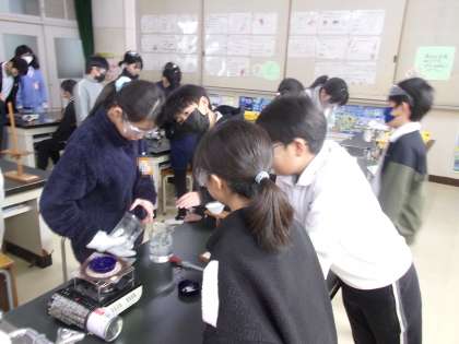 水溶液の中に溶けている物質を取り出すには、どうしたらよいでしょうか?熱したり、冷やしたりしながら、実験していました。13日(金)の授業の様子です。