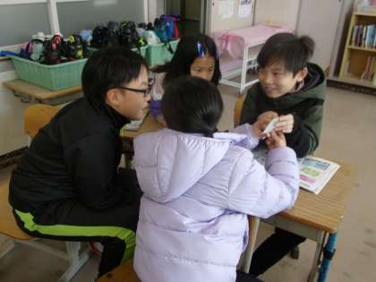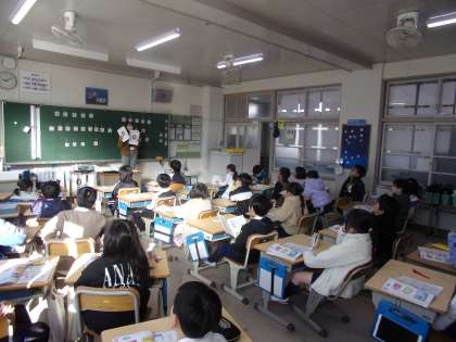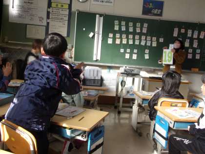 「MERRY CHRISTMAS」と「A HAPPY NEW YEAR」に含まれるアルファベットが、1文字ずつ、黒板にはってあります。この中から、順番にカードを選んでいき、合計得点を競います。少し前になりますが、16日(月)の授業の様子です。