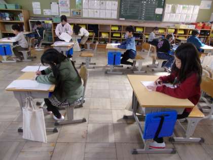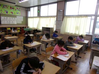 1年生の3組および4組の様子です。書き初めでは、紙を折ったり、消しゴムを使ったりすることができません。新年早々、なかなか緊張感があったと思います。みんな、よく頑張りました。