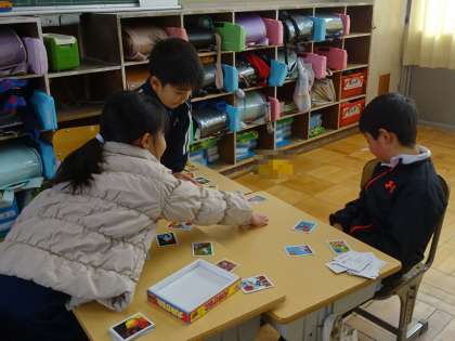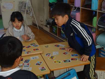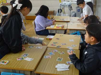昔からの言葉にふれる単元です。みんなで、楽しそうにことわざのかるたをしていました。