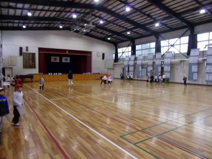 体育館で行う体育の授業の前に、校内書き初め展の見学をしていました。