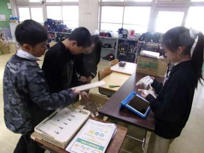 学習発表会の準備が本格化していました。4年生は、ビオトープを活用した学習を展開しています。この授業では、3クラスが一緒に活動しています。