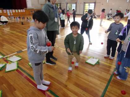 けん玉です。かなり難しいですが、みんな、がんばってチャレンジしていました。