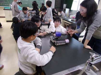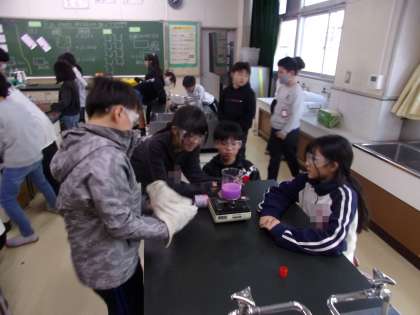 水を熱すると、どのように温まっていくのかを、示温インクを使って、実験していました。この実験、ひと昔前は、アルコールランプとおがくずや味噌を使っていました。何だかとても進歩したように感じてしまいます。