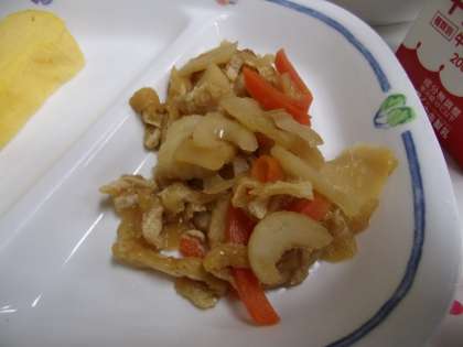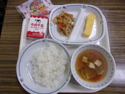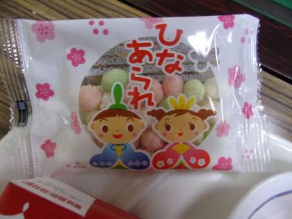 今日は、ひな祭りにちなんだ献立でした。「ちらし寿司」は、卵焼きの隣にある具を、自分でご飯に混ぜ込んで作ります。「ひなあられ」は…、きっと説明不要ですね。
