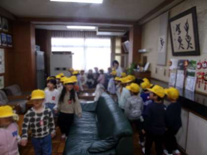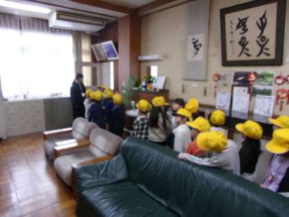 校長室を見学しに来ていました。30人以上もいるのですが、みんな、しっかり並んで歩けていました。なので、決して広くはない校長室を、安全にスムーズに通ることができました。また、「失礼します」「失礼しました」のあいさつもきちんとして出入りしていました。立派でした。