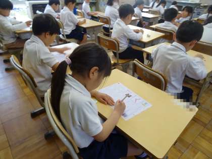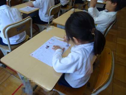 ひらがなの「く」を書く練習です。これは、先週の月曜日の学習の様子です。まずは、ひらがなを書けるように読めるようになることを目指していきます。