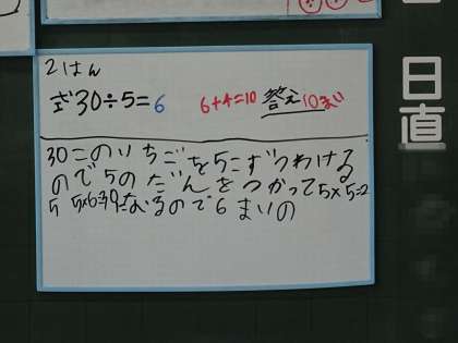 30個のいちごを、1皿に5個ずつ乗せました。お皿は、まだ4枚残っています。お皿は、全部で何枚ありますか?