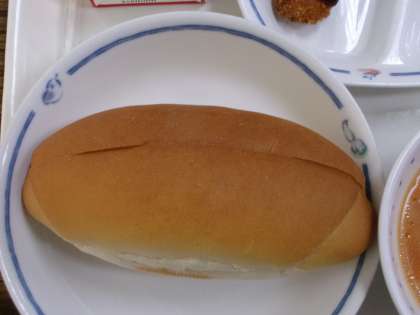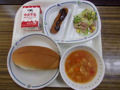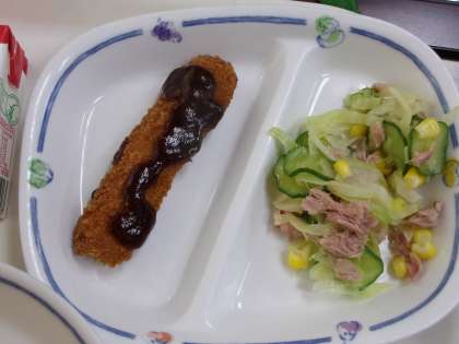 今日の給食は、「とんかつドッグ」でした。仕切り皿の左側にある、細長のとんかつを、切れ目の入ったパンにはさんで食べました。