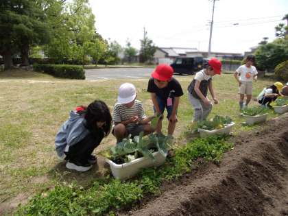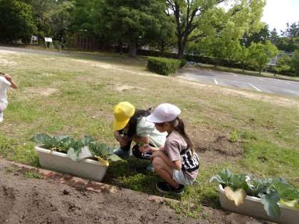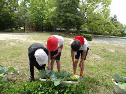 これらのキャベツの中には、その幼虫が多く住んでいます。興味があるのでしょう。休み時間も、いろいろな子が様子を見に来ています。さなぎになり、羽化していくのが、楽しみですね。