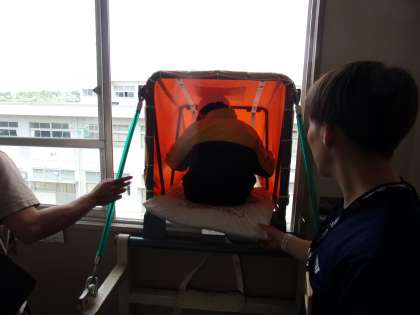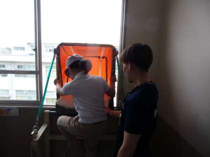 消防署の方にご指導いただきました。説明を聞き、入口から滑ります。