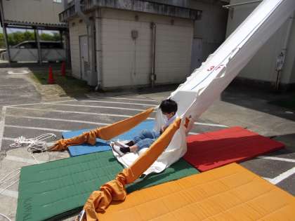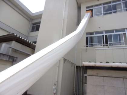 救助袋を滑っているとき、袋の外を撮影すると、上の写真のようになります。人が通っている部分が曲がっていることがよくわかると思います。これだけたわむことで、角度が緩やかになり、滑るときのスピードが速すぎてしまう…ということはないのです。
