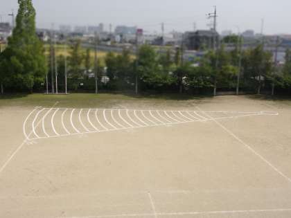 おおもとの白線は、10名程度の教職員が協力して計測しながら描きました。しかし、どうしても使っているうちに、薄くなってしまうので、毎朝、体育主任が濃くなるようになぞっています。
