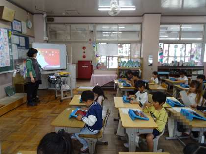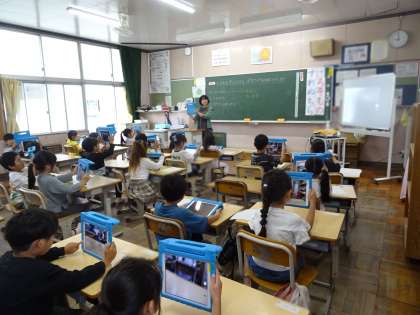 1年生も学習用タブレットを使うようになっていきます。この日、このクラスでは、カメラの使い方と「Teams」の使い方を学習していました。