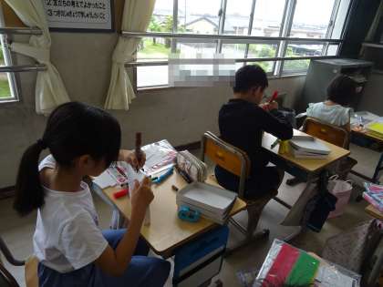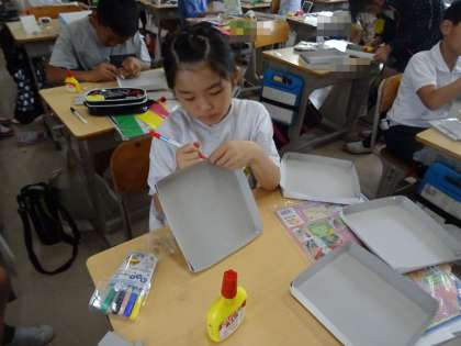 玉を転がして遊ぶ盤ゲームを作っています。この日は、仕上げの段階になっている子が多くいました。
