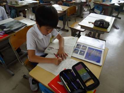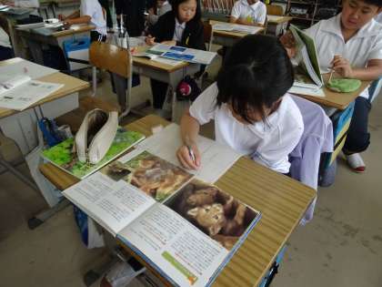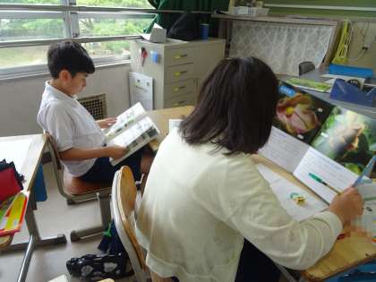 段落同士のつながりを考えながら、生き物のリーフレットや図鑑を作ります。そのために、まず、調べる動物を決め、本などを調べ始めました。