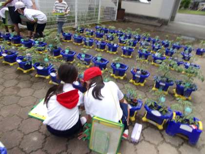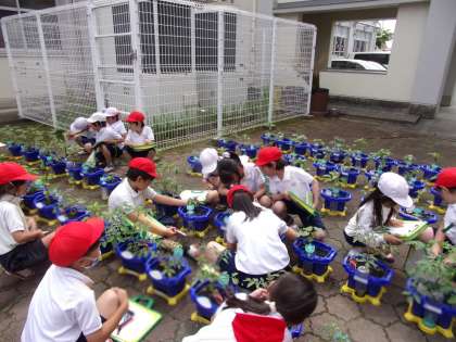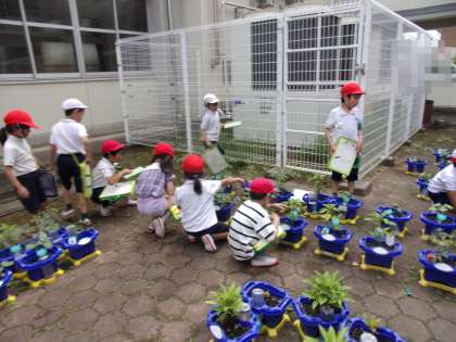 夏野菜の苗を植えてから2週間ほどが経ちました。子どもたちは、毎日世話をしています。そして、定期的に、生長を観察しています。これらは、23日(金)の活動の様子です。